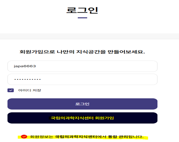 ②“국립의과학지식센터 회원가입” 클릭 (회원가입 시, 문자 본인인증 필요)