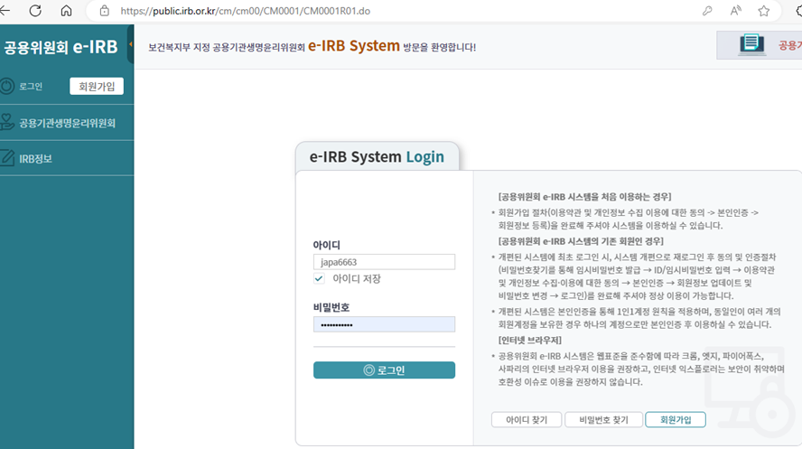 ①공용 e-IRB 로그인 (https://public.irb.or.kr/index.do