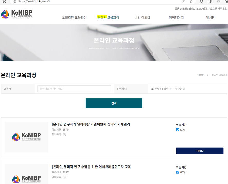 ②국가생명윤리정책원 “온라인 교육과정” 클릭 (https://www.nibp.kr/xe/irb