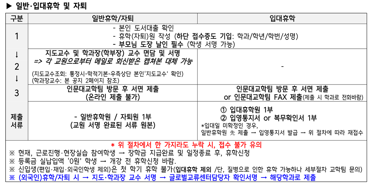 (일반휴학원 제출 후 입대휴학원 및 입영통지서를 제출하는 경우에 한해 팩스 및 이메일 제출 가능. 이외 전부 불가)
