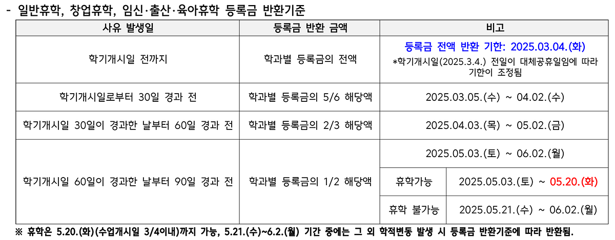 - 일반·창업·임신·출산· 육아휴학 접수 기간 : ~ 2025.05.20.(화)까지 (수업일수 ¾ 이내)